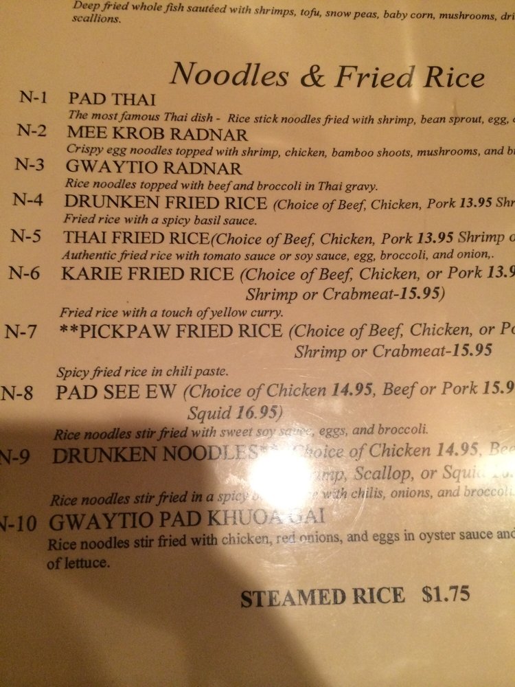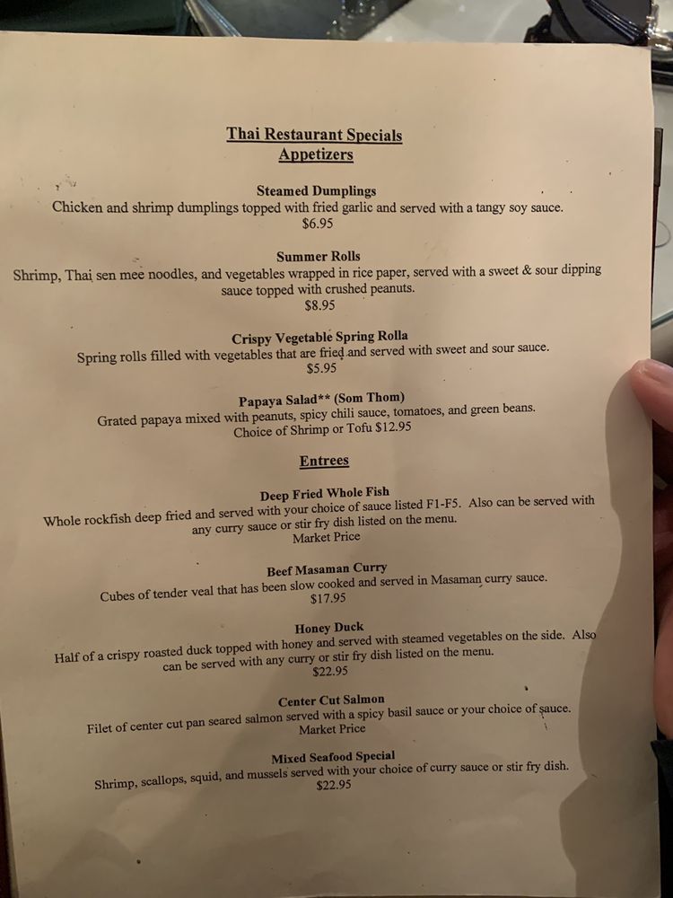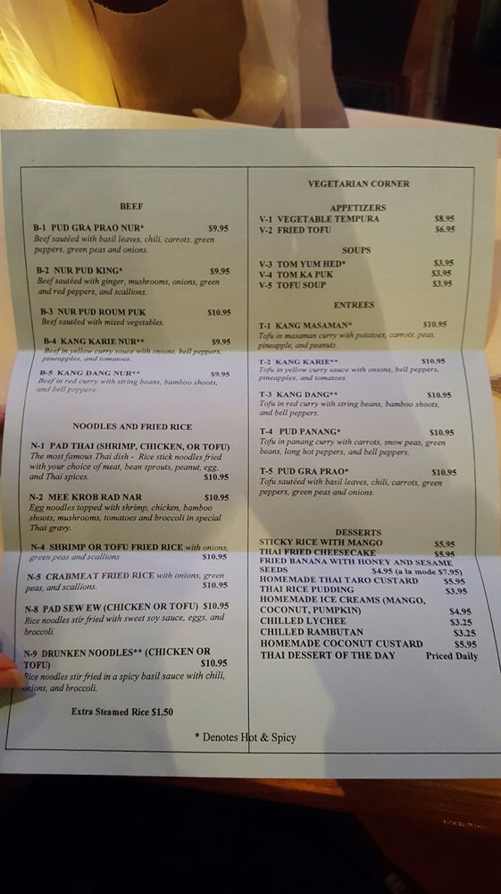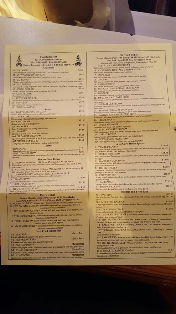 Introducing the menu at Thai Restaurant, located at 3316 Greenmount Ave in Baltimore, MD. This casual yet classy spot offers a wide range of Thai dishes, from appetizers like Tod Man Pla and Gai Sawan to salads like Thai Salad and Tuna Salad. The Vegetarian Corner also offers options like Vegetable Tempura and Tofu. With amenities such as takeout, delivery, and catering services, Thai Restaurant caters to a variety of dining needs. Customers rave about the fresh and authentic flavors of the dishes, praising the attentive service and welcoming atmosphere. Whether you're in the mood for a spicy papaya salad or a comforting bowl of pad see ew, Thai Restaurant offers a taste of traditional Thai cuisine in the heart of Baltimore. So, if you're looking for a charming and well-worn establishment with delicious food and great service, Thai Restaurant is the place to be.